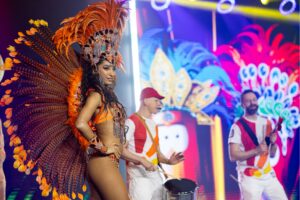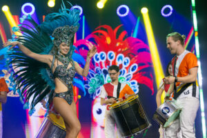 To nasza najbardziej widowiskowa propozycja – kompletne show przenoszące gości do Rio de Janeiro. Łączymy potężną sekcję perkusyjną Ritmo Bloco z profesjonalnymi tancerzami i tancerkami samby brazylijskiej. To feeria barw, piór, autentycznych kostiumów i mistrzowskiej choreografii. Show jest interaktywne – po części pokazowej tancerze zapraszają gości do wspólnej nauki podstawowych kroków, co gwarantuje rozkręcenie każdej imprezy karnawałowej, wesela czy ekskluzywnego bankietu.
